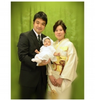 みどり色の布地の背景になります。微妙な立体感と光沢があり、明るい色や暖色系のお衣装との相性が良いです。被写体は男女ともに向きます。